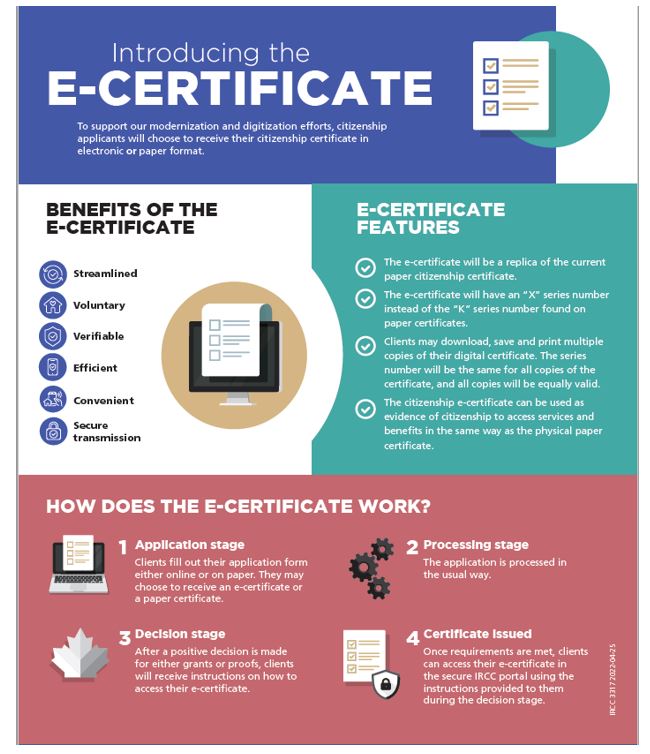The e-certificate initiative will roll out this summer. In this first phase, IRCC will invite applicants to choose whether they wish to receive electronic or paper citizenship certificate. IRCC kindly prepared a graph (please see below) summarizing what the Canadian citizenship applicants can expect in the initial phase: